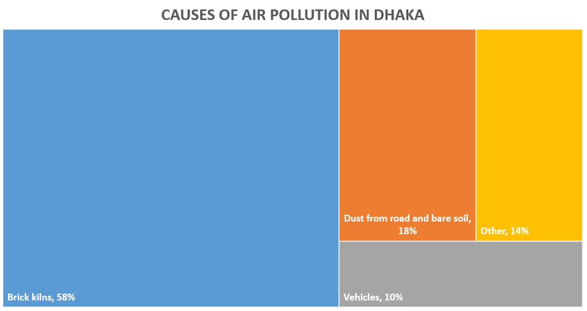 Not only does the manufacturing of building materials have significant energy-related GHG emissions, but it also causes high levels of air pollution. For example, according to the Norwegian Institute for Air Research, brick manufacturing kilns in and around Dhaka are responsible for 58 percent of the capital city’s air pollution — much more than cars, power generation and other industries combined.
