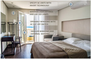 Guest rooms account for 80 percent of energy use in a hotel, so design and specification matter. According to the EDGE software, a five-star hotel in a tropical city such as Accra, Ghana can save 20 percent of its overall energy usage by including the following in its 200 rooms: